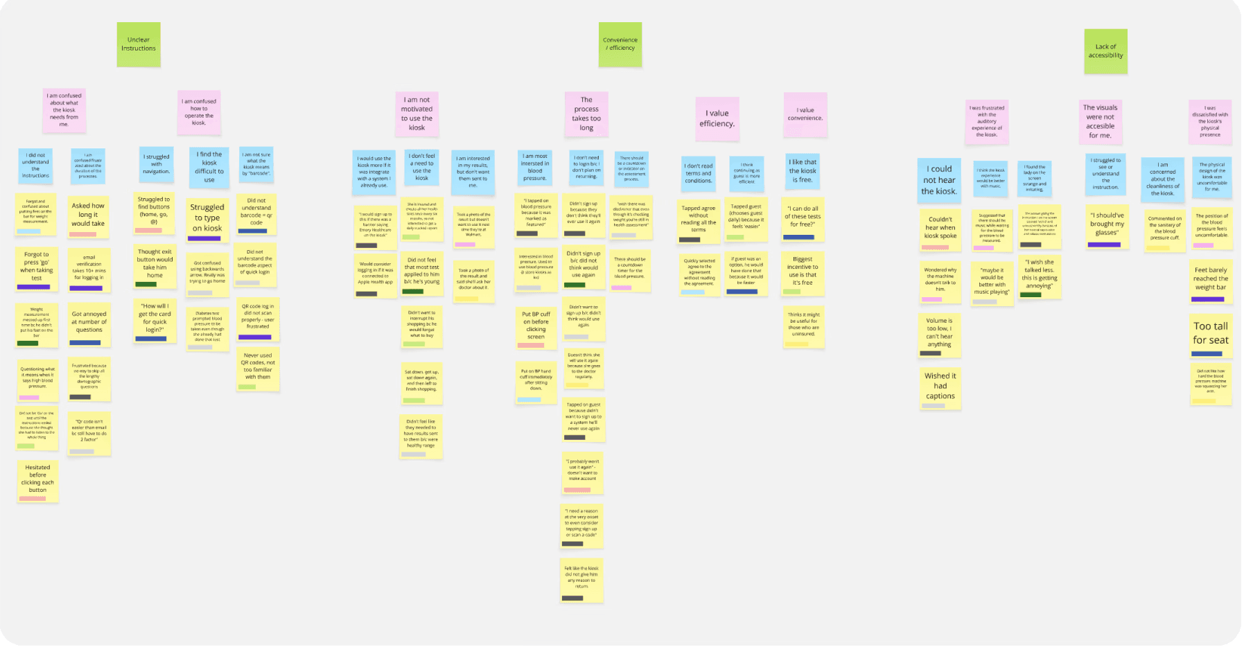 1:1 contextual interviews were conducted to get a better sense of user motivations and pain points with using the kiosk.