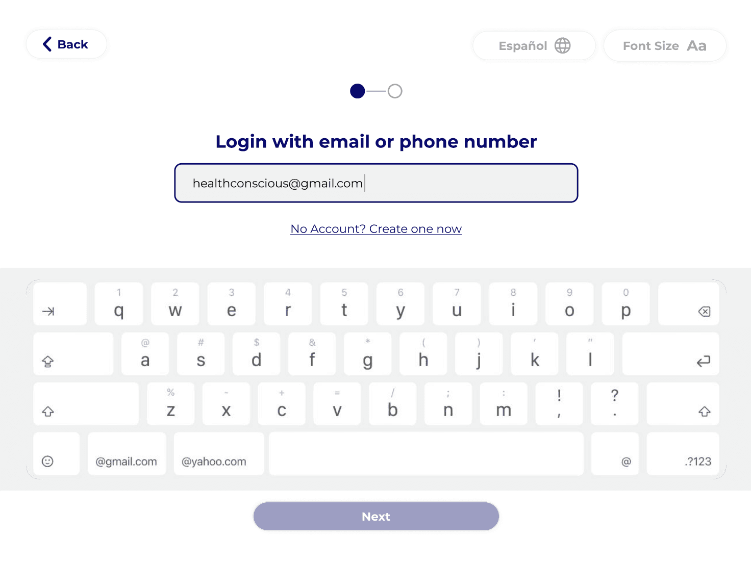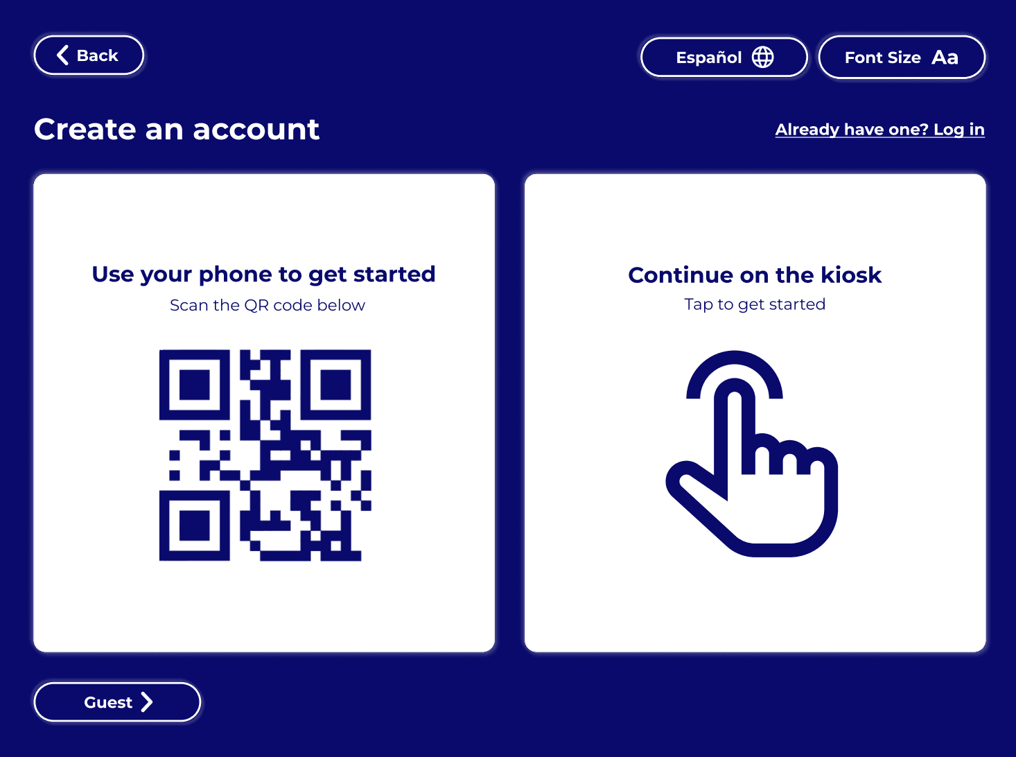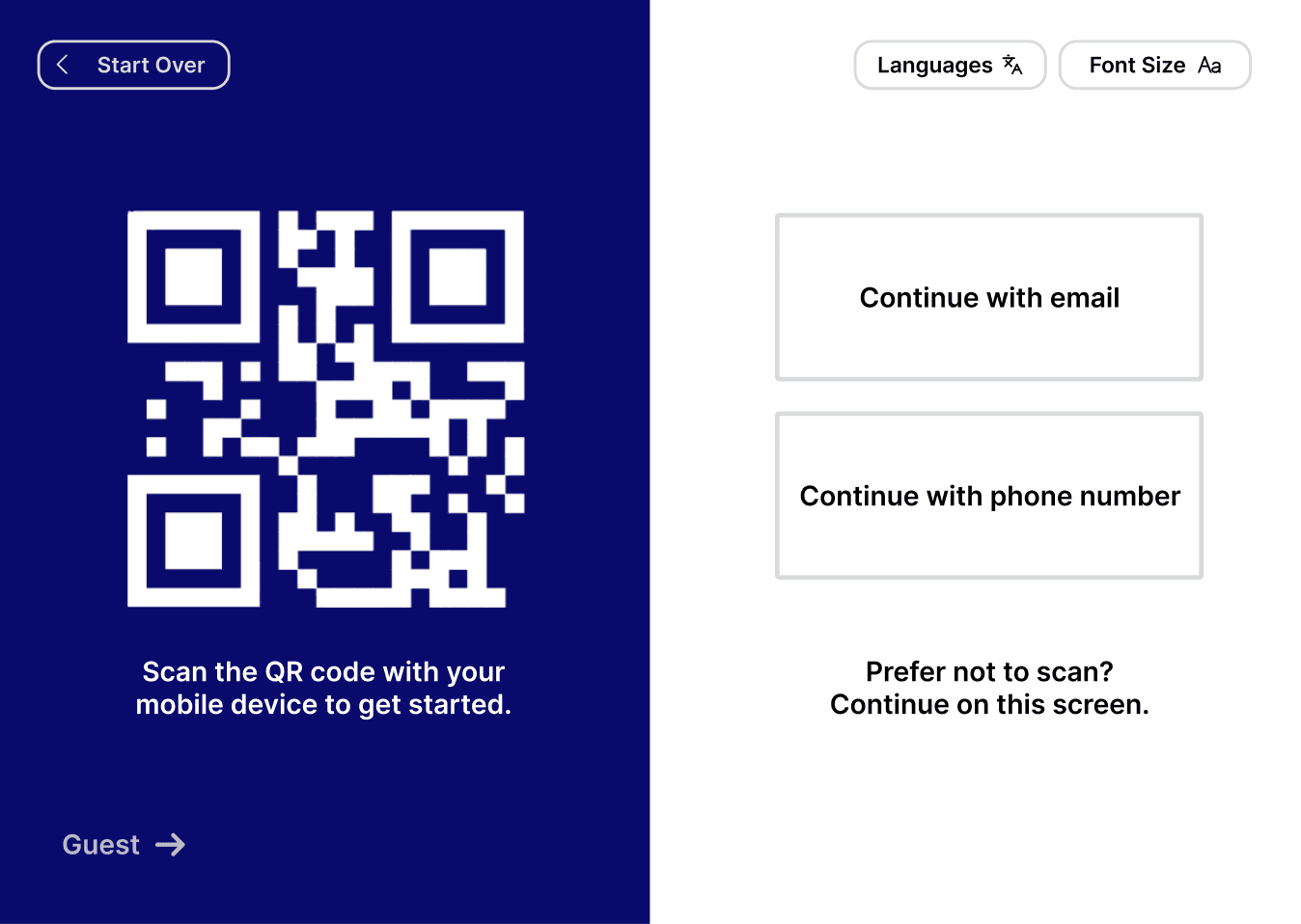 Users should have various login options: email/phone on kiosk, QR code to fill out on personal mobile device.